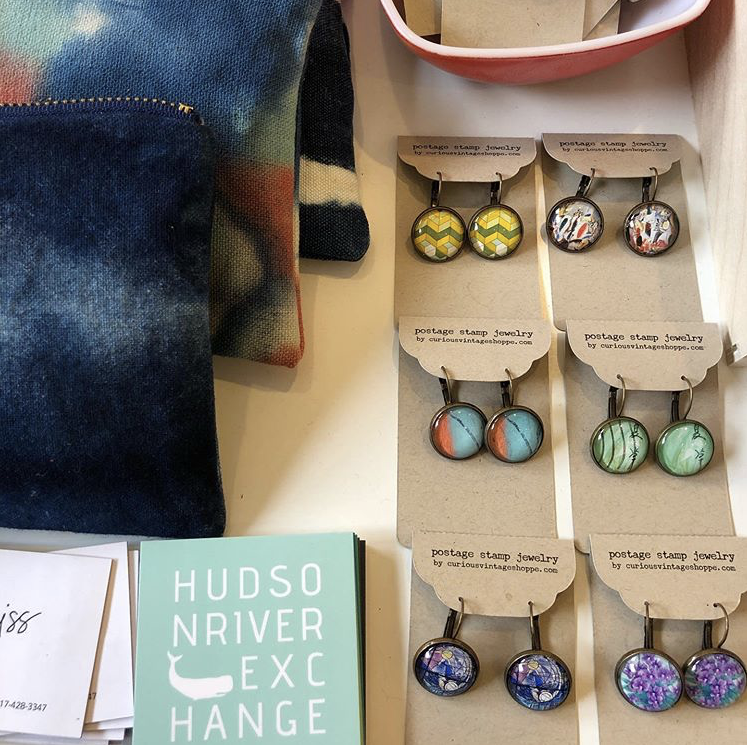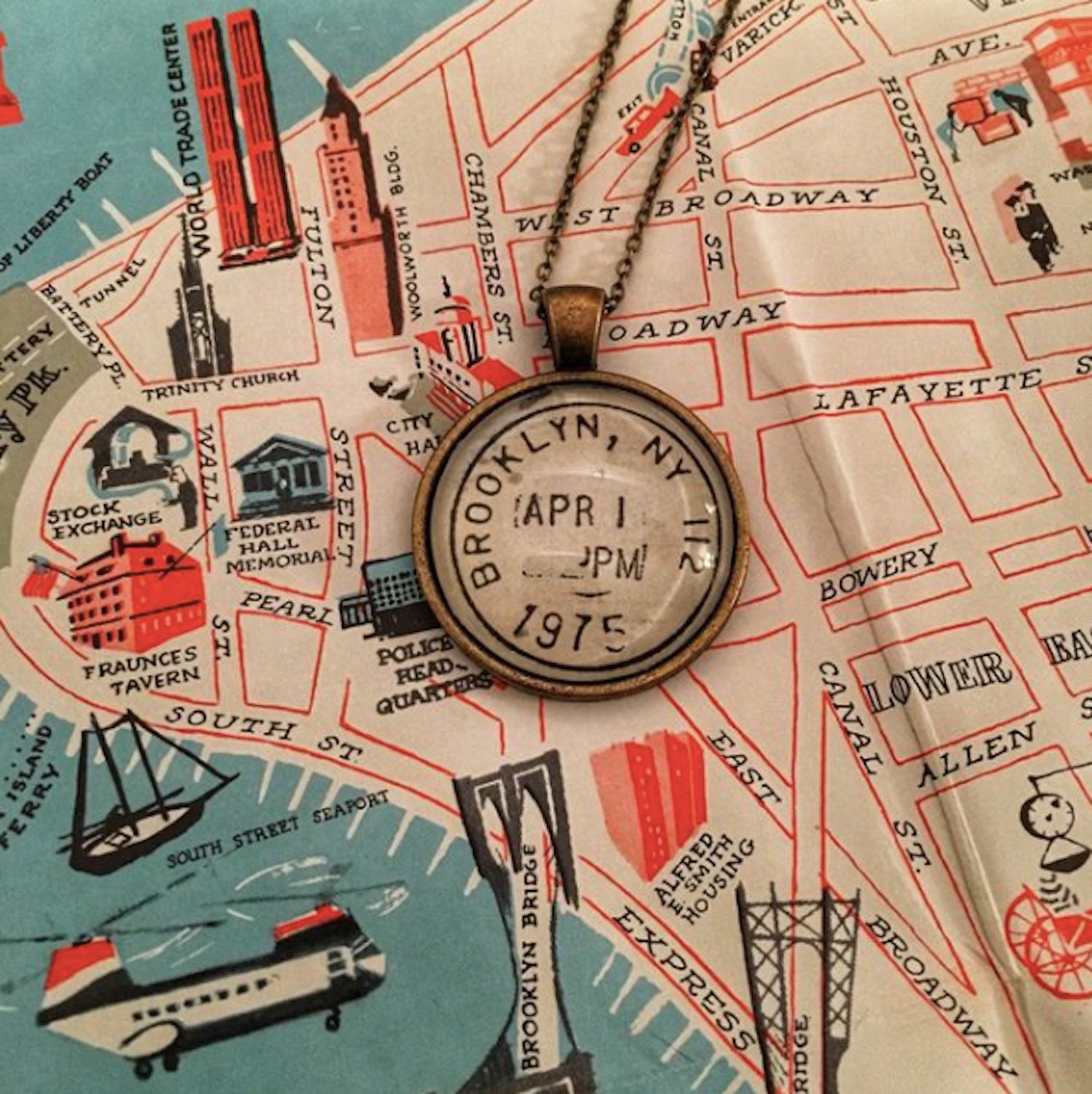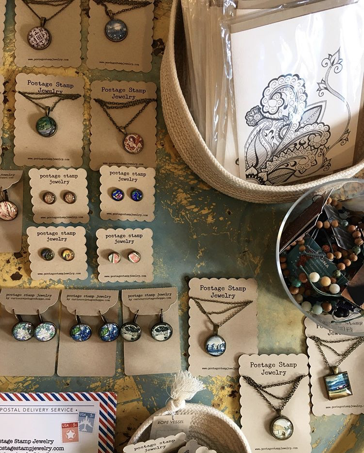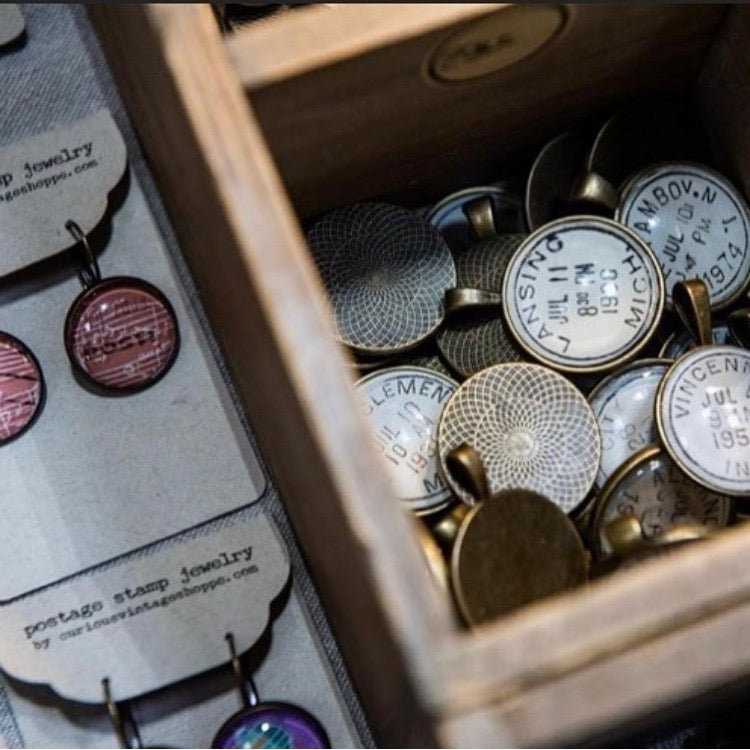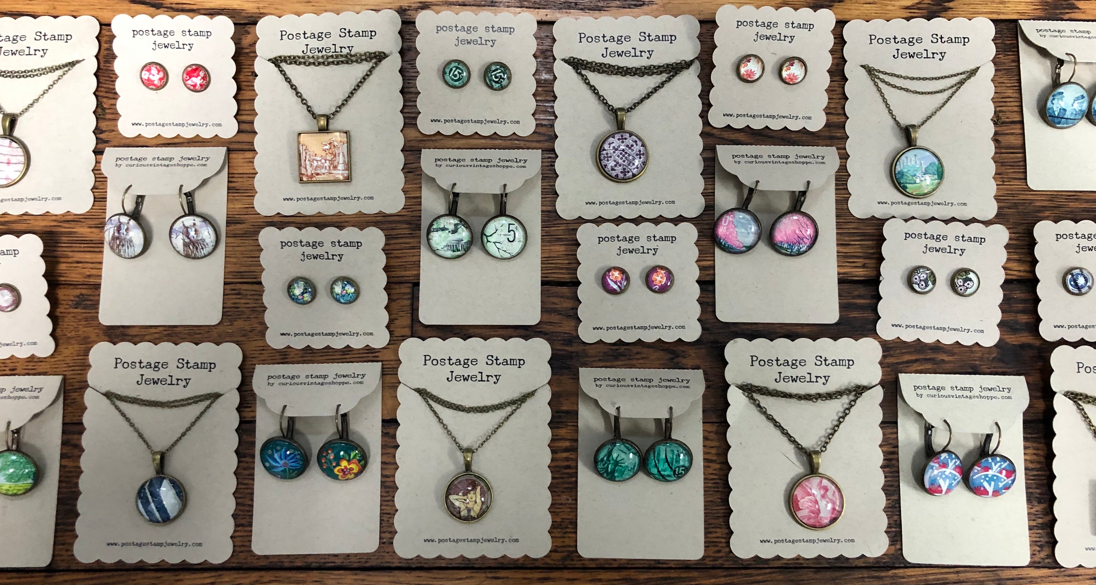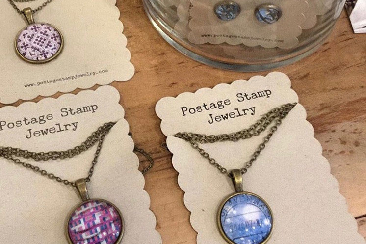 Handmade jewelry from vintage, cancelled postage stamps that have travelled around the globe. Each piece of jewelry is one-of-a-kind and your wearing will add miles to its travels!
