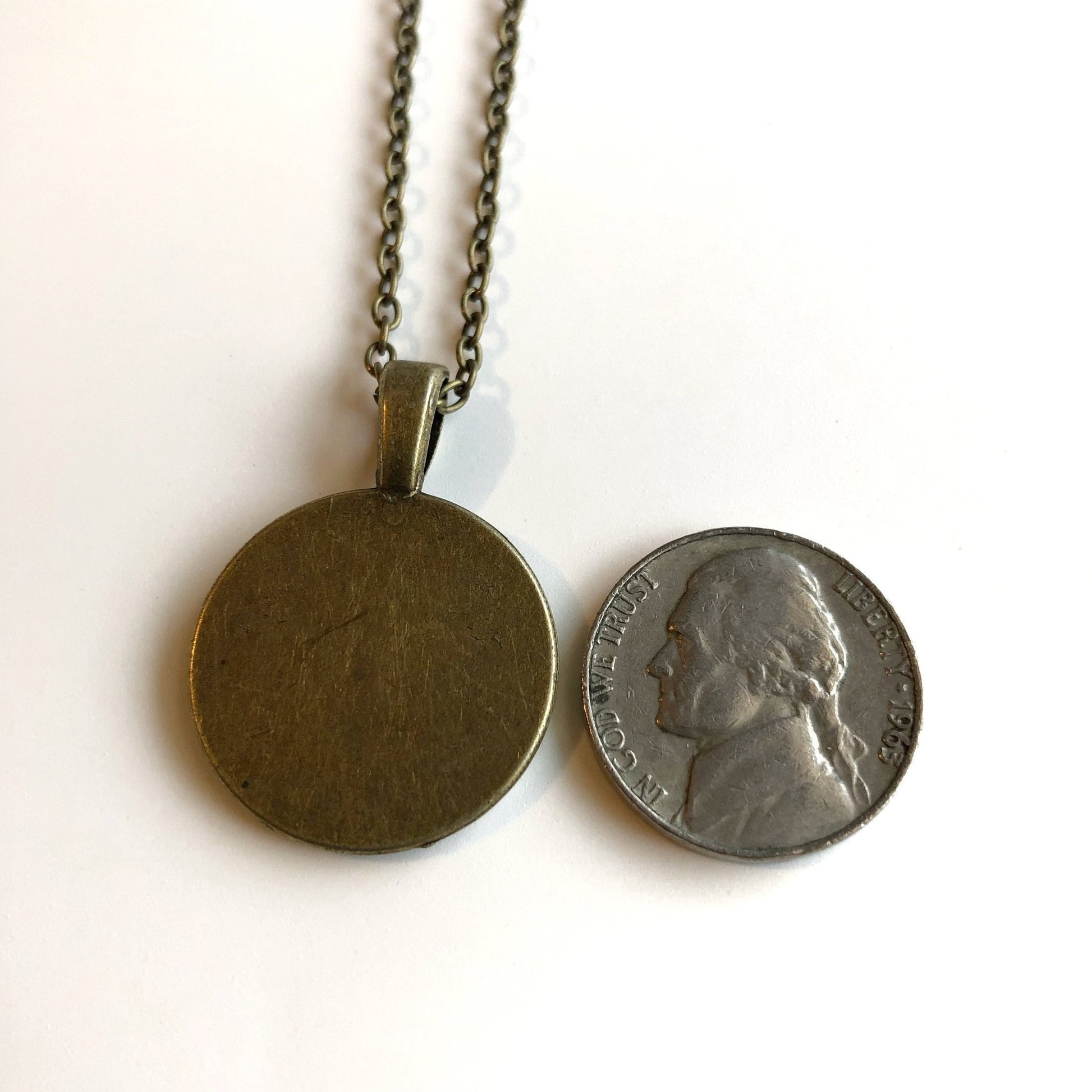 The size of the pendant is 20mm and the chain is 18 inches long, in a matching antique bronze finish with a lobster clasp.