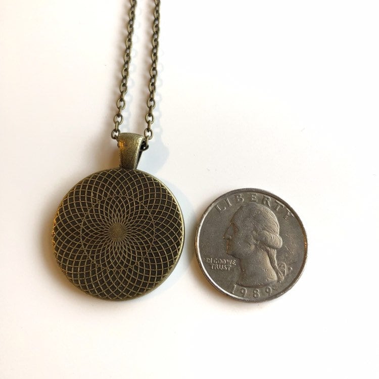 The size of the pendant is 1” and the chain is 18 inches long, in a matching antique bronze finish with a lobster clasp.